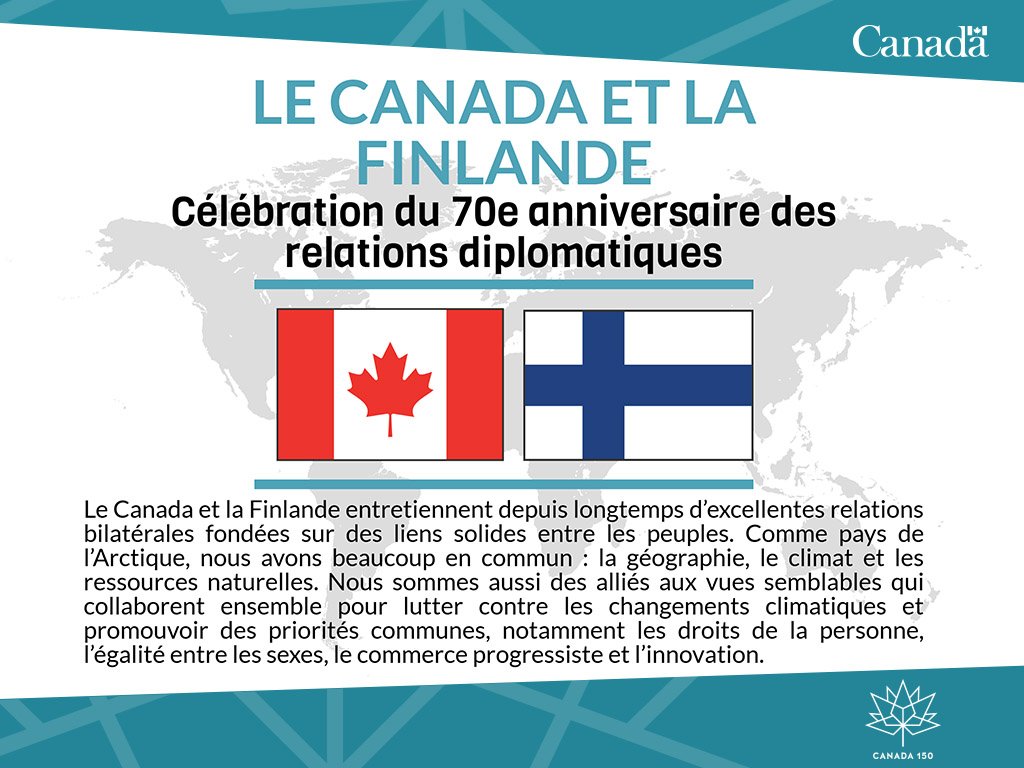 Aujourd’hui, nous célébrons 70 ans de liens diplomatiques avec la #Finlande – un véritable ami et allié! #Canada150 #Finland100pic.twitter.com/pEixtXd0un