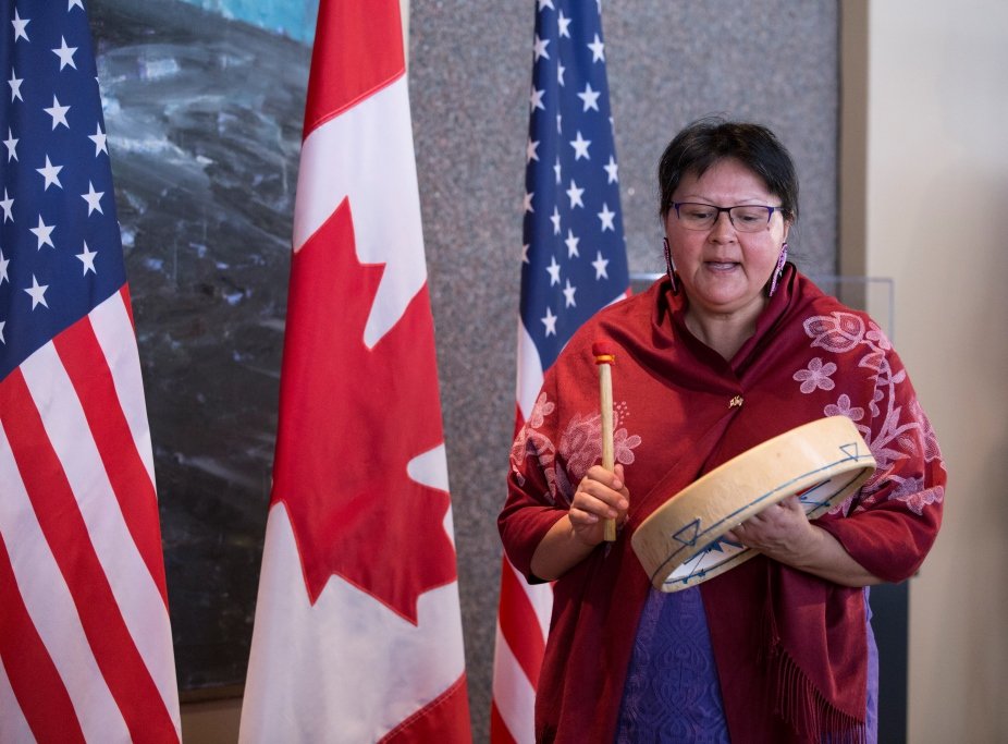Accueil autochtone pour Rex Tillerson. Durant la cérémonie reconnaissant que sa visite à Ottawa avait lieu sur les terres ancestrales des Algonquins, le secrétaire d’État a été accueilli par des chants et des battements de tambours traditionnels et par l’aîné Albert Dumontpic.twitter.com/hutNryGvl4
