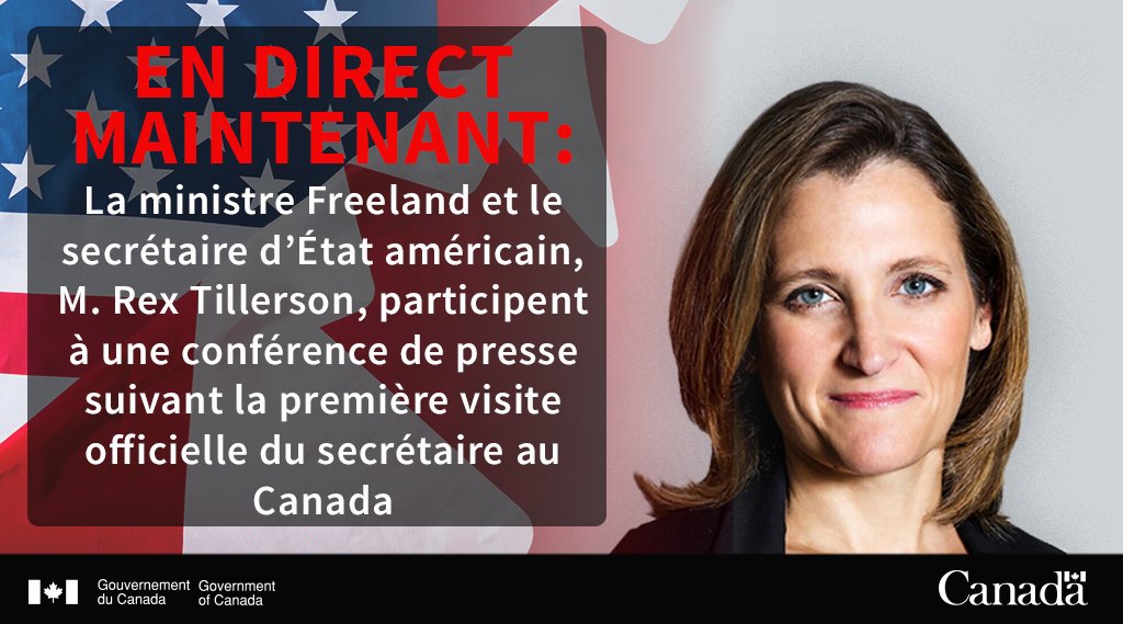EN DIRECT DANS 30 MINUTES : La ministre Freeland et Rex Tillerson, secrétaire d’État américain, tiennent une conférence de presse après la première visite officielle du secrétaire d’État au Canada #CanÉU @StateDept