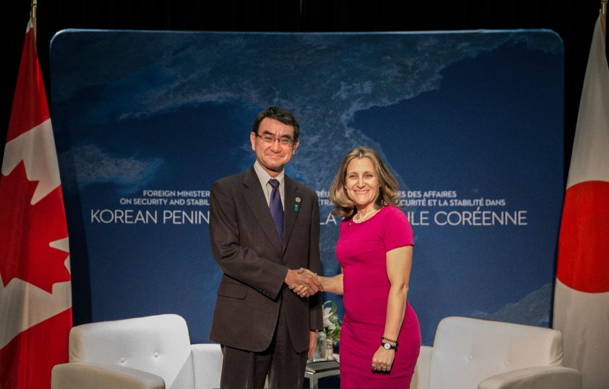 La min. Freeland & Taro Kono, min. affaires étrangères #Japon ont réaffirmé intérêts partagés en sécurité & préoccupations sur actions de #CoréeduNord & discuté soutien indéfectible du Canada envers le Japon & autres partenaires régionaux. #Vancouver #PéninsuleCoréennepic.twitter.com/ZX6M0hy21l