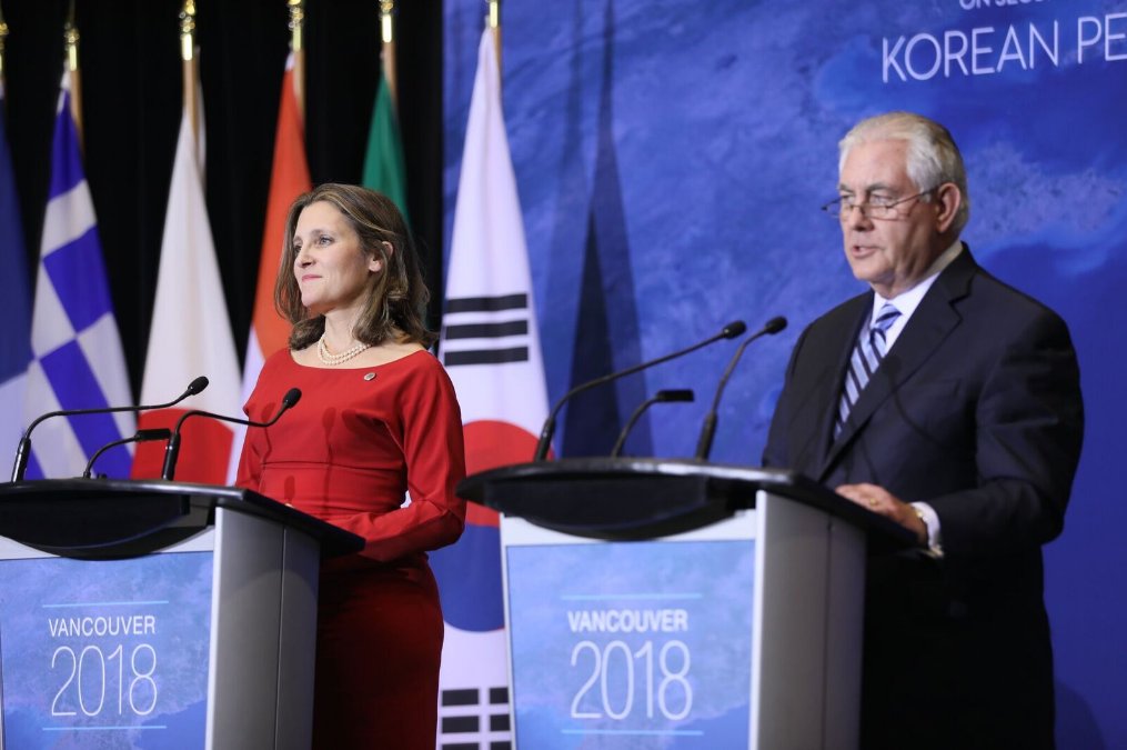 Ministre Freeland & Rex Tillerson secrétaire d'État américain à conf presse pour conclure réunion min Affaires étrangères #PéninsuleCoréenne. La communauté mondiale a montré av paroles+gestes que #CoréeduNord ne sera jamais acceptée comme pays nucléaire http://ow.ly/5sGC30hPfVO pic.twitter.com/bc58Tuqr0s