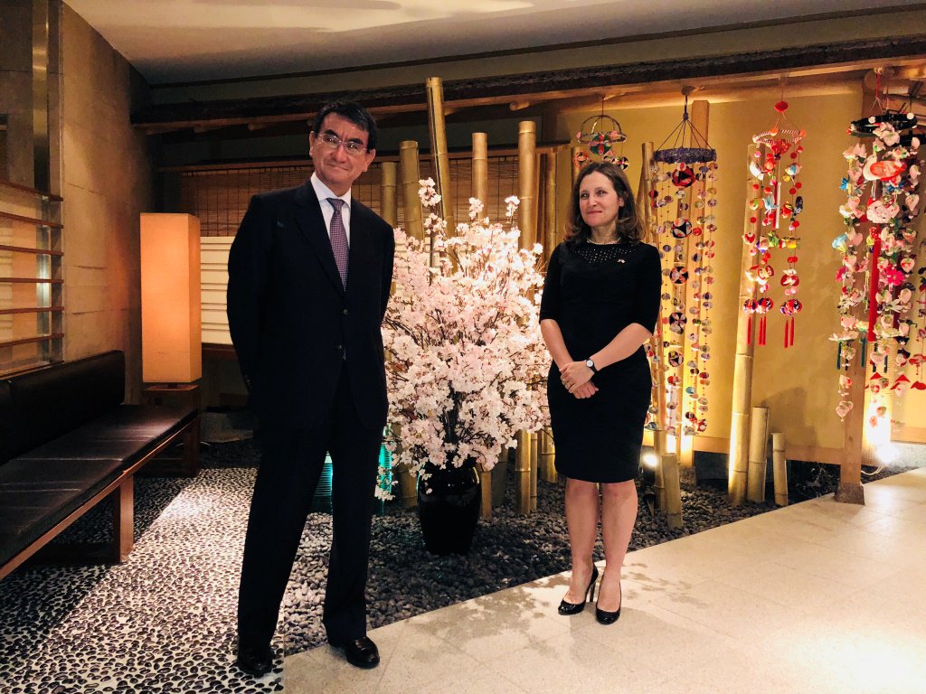 La min Freeland & homologue #Japon Taro Kono ont partagé leurs vues lors souper de travail sur enjeux internationaux actuels, tels que situation #DroitsDeLaPersonne #CoréeduNord, #commerce av partenaires mondiaux, dont #É-U & questions sécurité ds #PéninsuleCoréenne @MofaJapan_enpic.twitter.com/HINB3MFX8n