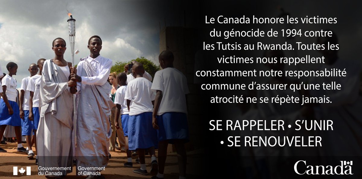 Aujourd’hui, le Canada est solidaire avec le Rwanda afin de commémorer le génocide de 1994 contre les Tutsis. Nous nous souvenons de tous ceux qui s’y sont opposés et ont péri, et saluons l’esprit de résilience et de réconciliation du peuple rwandais.pic.twitter.com/Odv6YK0dns