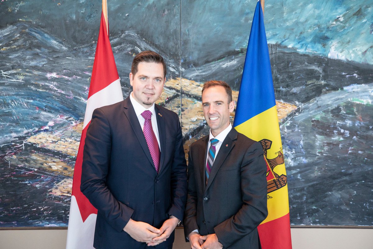 PS DeCourcey meets with #Moldova Foreign Minister @Tudor_Moldova to discuss issues such as #democracy, #sovereignty, rules-based int’l order, inclusive economic growth & shared partners such as the #EU, and the growing 🇨🇦🇲🇩relationship.pic.twitter.com/tXckmxvVaY
