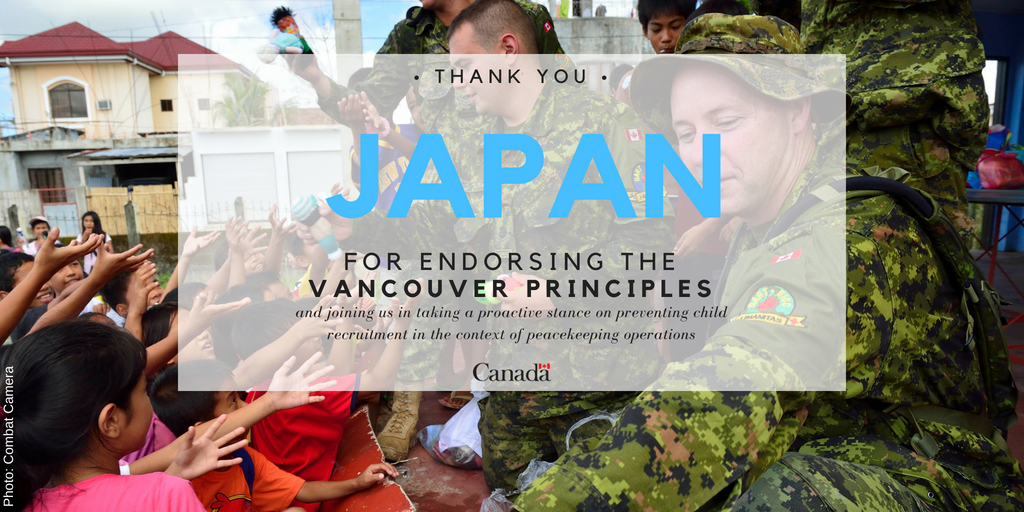 Canada thanks Japan for its endorsement of the #VancouverPrinciples. 🎌   By joining the other 65 Member States who have endorsed thus far, Japan is demonstrating its commitment to confronting the problem of #childsoldiers. For more info: http://ow.ly/4BDu30ljefl pic.twitter.com/STxZXK0hgZ