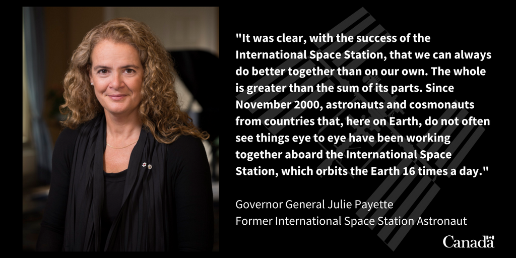 It's @WorldSpaceWeek! @GGJuliePayette used the International Space Station as example of how we are #BetterTogether in her inaugural addresspic.twitter.com/8G7UkndZp4