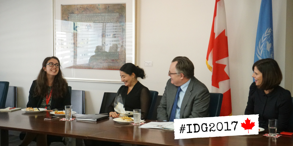 Natasha, our Ambassador for the day, w/@Women_Canada Minister Monsef, Ambassador Blanchard, @blais_louise & UN PRs discussing the importance of partnerships in creating a better future for girls & young women.
