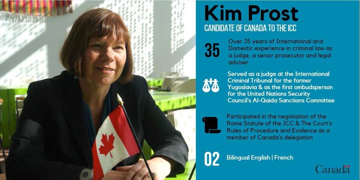 On Monday, the @UN will elect 6 new judges to the @IntlCrimCourt. Meet Canada’s highly qualified candidate for judge, Kimberly Prost :pic.twitter.com/Bki88CnQ6b