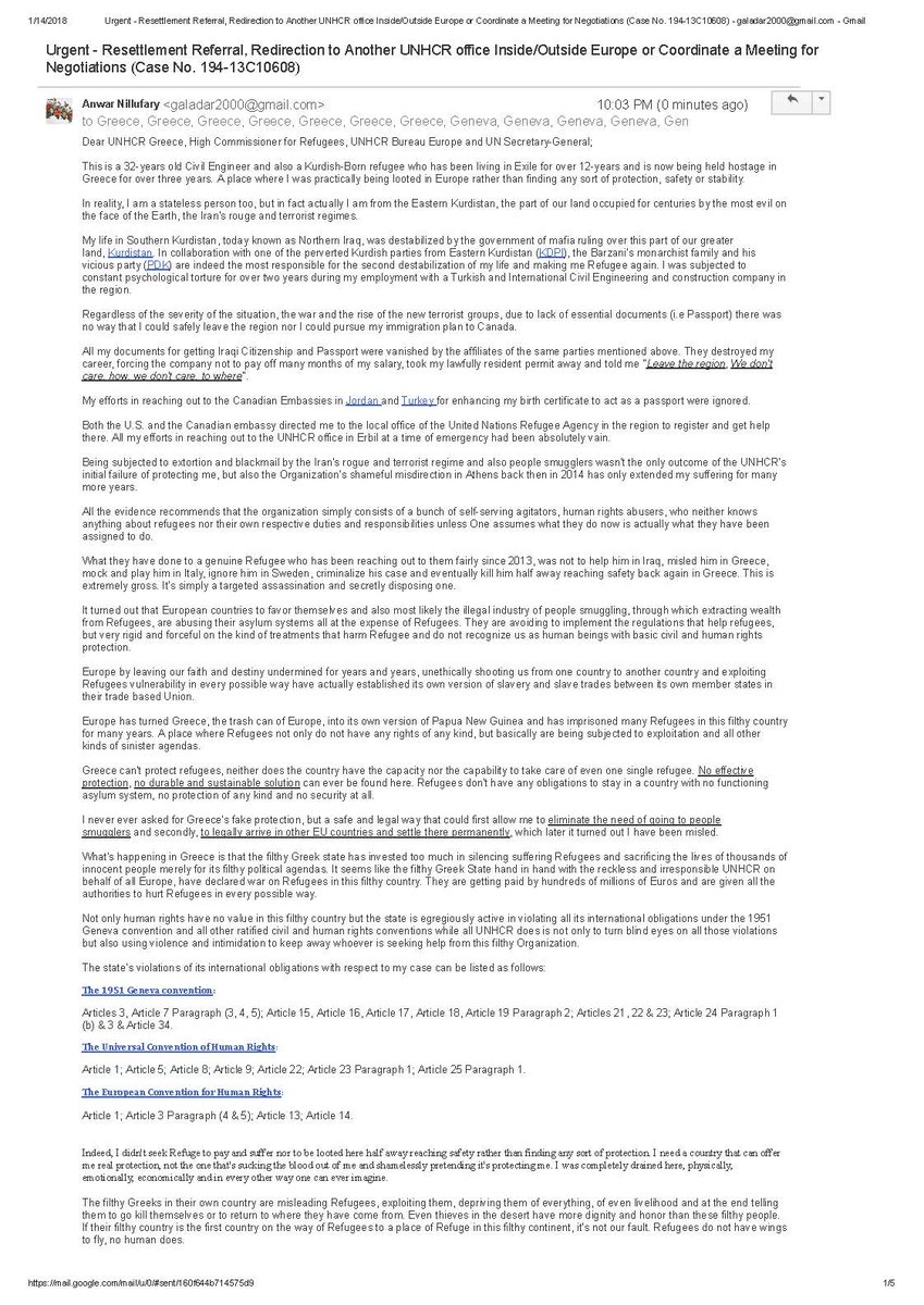 @UNHCRGreece reaching out to you again the@CanadaUN and seeking a response to the propositions I addressed to Canada. I'm a Refugee in exile for +12 years, held Hostage in Greece for +3 years & I dire need of Resettlement or a Safe Passage. Please Help! 2/2pic.twitter.com/naZ3ZzlDK5Thanks. Twitter will use this to make your timeline better. UndoUndo