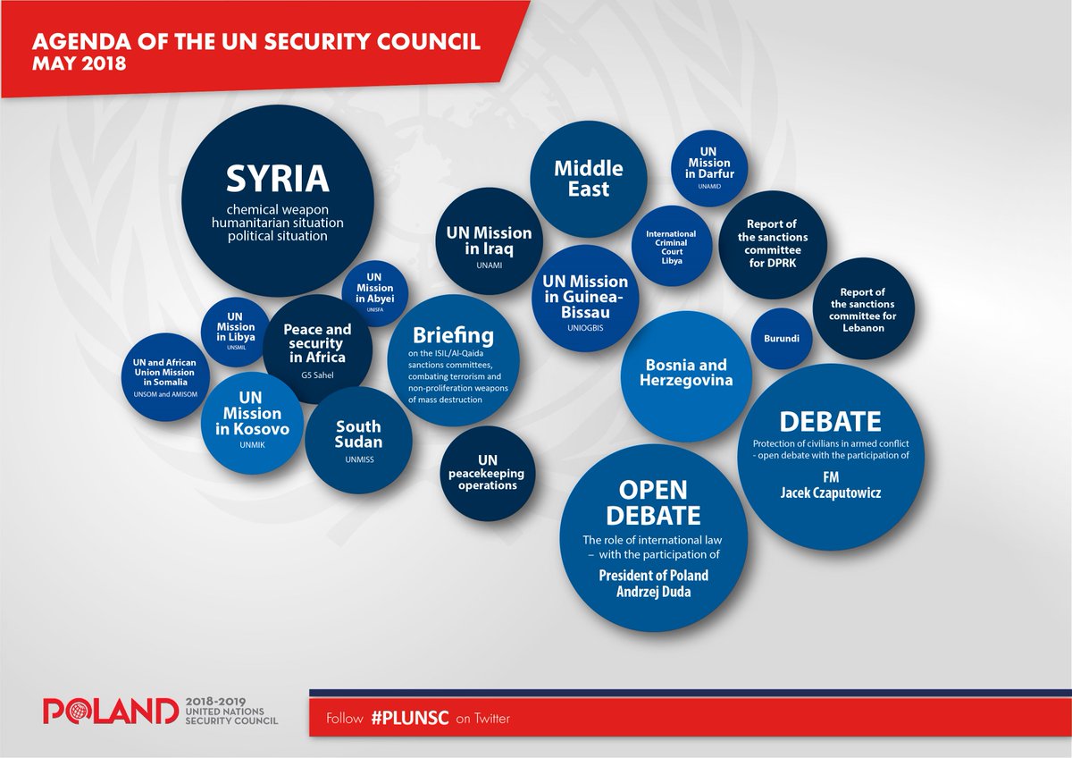 Today #Poland is starting its one month #UNSC Presidency! Provisional programme of work for May to be formally approved on 3rd May but here’s an overview of what to expect on the agenda this month: