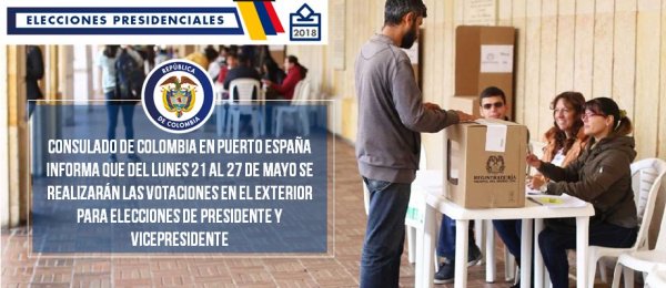 #Consulado de Colombia en Puerto España informa que del lunes 21 al 27 de mayo se realizarán las votaciones en el exterior para elecciones de Presidente y Vicepresidente. #EleccionesColombia #ColombianosEnPuertoEspaña http://puertoespana.consulado.gov.co/newsroom/news/2018-05-18/16832 …pic.twitter.com/sgJt20zlAx