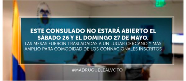 Este consulado no estará abierto el sábado 26 y el domingo 27 de mayo. Las mesas fueron trasladadas a un lugar cercano y más amplio para comodidad de los connacionales inscritos #EleccionesColombia #ColombianosEnBoston http://boston.consulado.gov.co/newsroom/news/2018-05-25/17043 …pic.twitter.com/I2dsTfP7VR