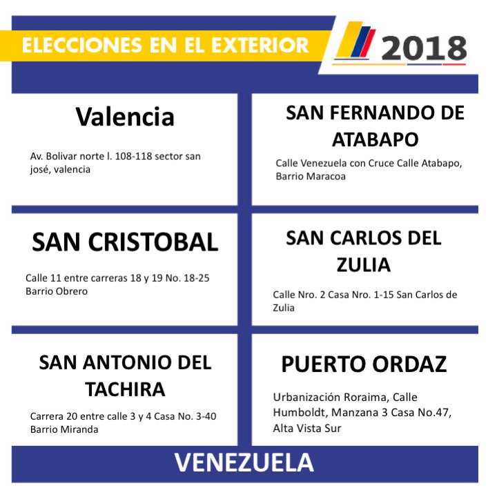 #Atención #ColombianosEnVenezuela si usted quedó inscrito para estas ciudades, Recuerde que el 27 de mayo podrá votar de 8 a.m. a 4 p.m. hora local. Verifique su lugar de votación en https://consulta.infovotantes.co/#/consultavotacion … #MadrúgueleAlVoto #EleccionesColombiapic.twitter.com/iZ90K8JE5q