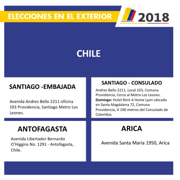 #Atención #ColombianosEnChile si usted quedó inscrito para estas ciudades, Recuerde que el 27 de mayo podrá votar de 8 a.m. a 4 p.m. hora local. Verifique su lugar de votación en https://consulta.infovotantes.co/#/consultavotacion … #MadrúgueleAlVoto #EleccionesColombiapic.twitter.com/cTGlDFxEtS