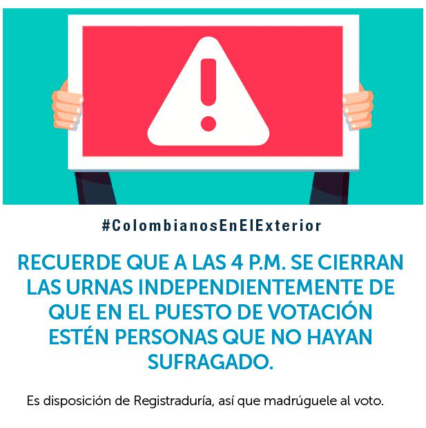 Quedan pocas horas para que culminen las #EleccionesEnElExterior. Si aún no ha ejercido su derecho lo invitamos a que se acerque a su puesto de votación. #MadrúgueleAlVotopic.twitter.com/ujl0ibIpEU