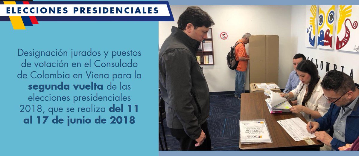 Designación jurados y puestos de votación en el Consulado de Colombia en Viena para la segunda vuelta de las elecciones presidenciales 2018, que se realiza del 11 al 17 de junio de 2018 http://viena.consulado.gov.co/node/news/17237/designacion-jurados-y-puestos-votacion-consulado-colombia-viena-la-segunda-vuelta …pic.twitter.com/nBcUwh8DvQ