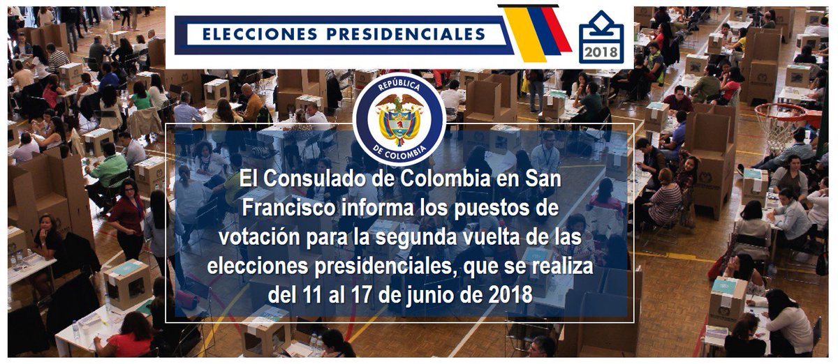 El Consulado de Colombia en San Francisco informa los puestos de votación para la segunda vuelta de las elecciones presidenciales, que se realiza del 11 al 17 de junio de 2018 http://sanfrancisco.consulado.gov.co/node/news/17241/consulado-colombia-san-francisco-informa-los-puestos-votacion-la-segunda-vuelta-las …pic.twitter.com/9D4iNIA8Ut