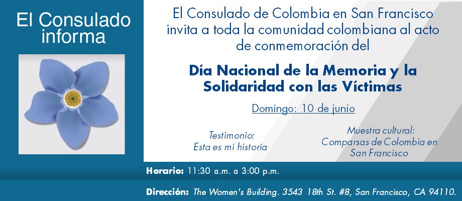 #ColombianosEnSanFrancisco 10 de junio: Día Nacional de la Memoria y la Solidaridad con las Víctimas http://sanfrancisco.consulado.gov.co/node/news/17240/10-junio-dia-nacional-la-memoria-y-la-solidaridad-con-las-victimas …pic.twitter.com/vsGo4bkXmH