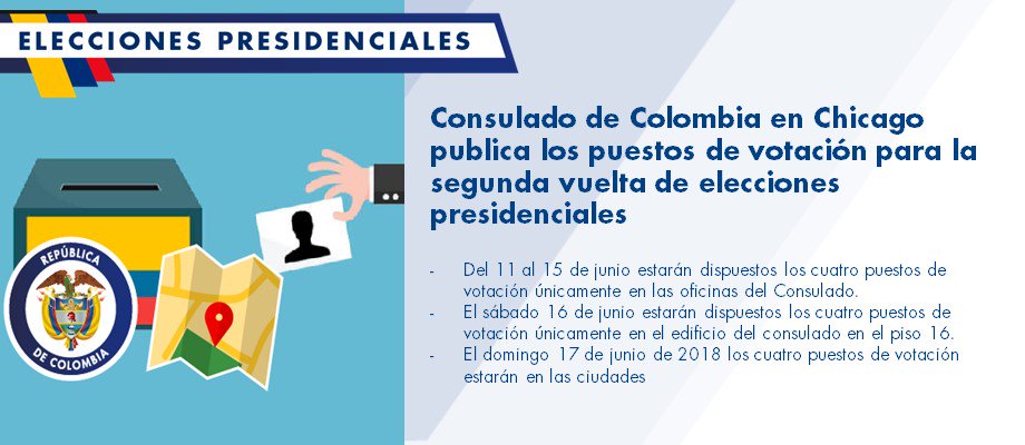 Consulado General de Colombia en Chicago publica los puestos de votación para la segunda vuelta de elecciones presidenciales http://chicago.consulado.gov.co/newsroom/news/2018-06-07/17259 …pic.twitter.com/78Tnpm8V50