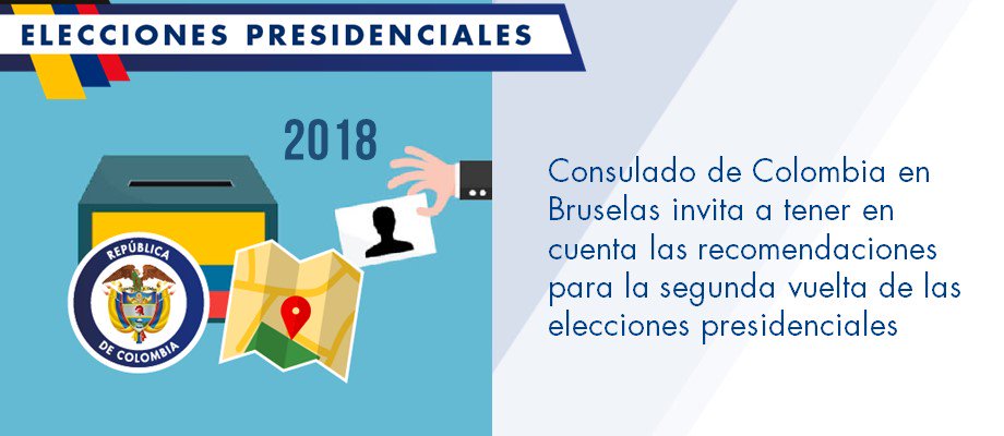 Consulado de Colombia en Bruselas invita a tener en cuenta las recomendaciones para la segunda vuelta de las elecciones presidenciales http://bruselas.consulado.gov.co/newsroom/news/2018-06-07/17260 …pic.twitter.com/BlLOz1LSZX