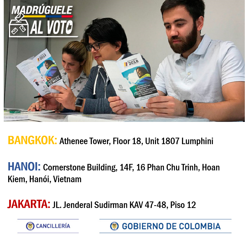 AHORA: Abrimos mesas de votación en BANGKOK, HANOI y JAKARTA. #MadrúgueleAlVoto en nuestros Consulados de 8am a 4pm hasta el 17 de junio para elegir al próximo Presidente de Colombiapic.twitter.com/9ifInOcvjO