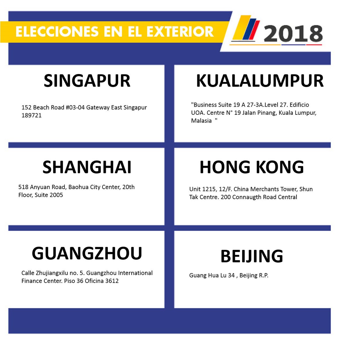 8:00 a.m. (hora local) en Singapur, Kualalumpur, Shanghai, Hong Kong, Guangzhou Y Beijing: se abren los puestos de votación para que los colombianos participen de la segunda vuelta presidencial. Jornada va hasta el 17 de junio de 8am a 4pmpic.twitter.com/EYxLekqSVe