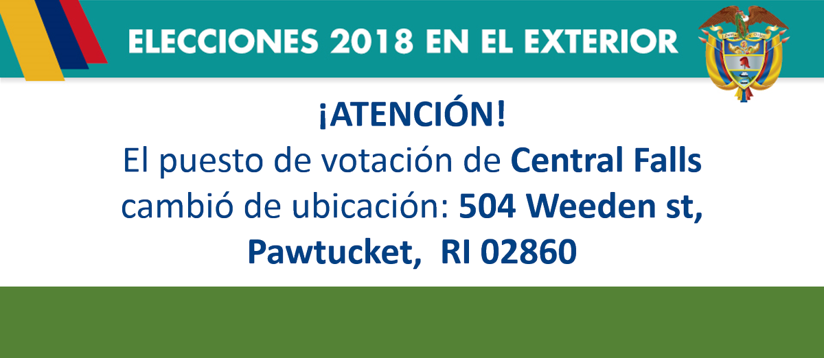 #ColombianosEnBoston El domingo 17 de junio quienes estén inscritos en el puesto de votación de Central Falls podrán votar en: 504 Weeden st, Pawtucket, RI 02860 http://boston.consulado.gov.co/newsroom/news/2018-06-13/17412 …pic.twitter.com/JcAPFwwSXg