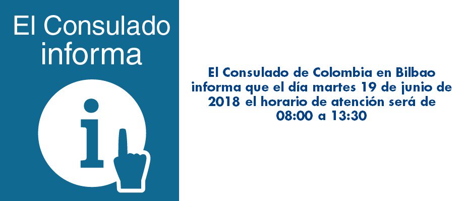 El Consulado de Colombia en Bilbao informa que el día martes 19 de junio de 2018 el horario de atención será de 08:00 a 13:30 http://bilbao.consulado.gov.co/newsroom/news/2018-06-14/17421 …pic.twitter.com/3tqcK19oPq