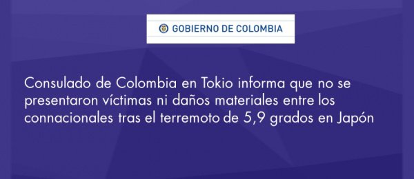 Consulado de Colombia en Tokio informa que no se presentaron víctimas ni daños materiales entre los connacionales tras el terremoto de 5,9 grados en Japón http://tokio.consulado.gov.co/newsroom/news/2018-06-18/17535 …pic.twitter.com/3tayWswGDH