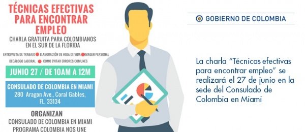 La charla “Técnicas efectivas para encontrar empleo” se realizará el 27 de junio en la sede del Consulado de Colombia en Miami http://miami.consulado.gov.co/newsroom/news/2018-06-19/17547 …pic.twitter.com/yxWO5dnfBd