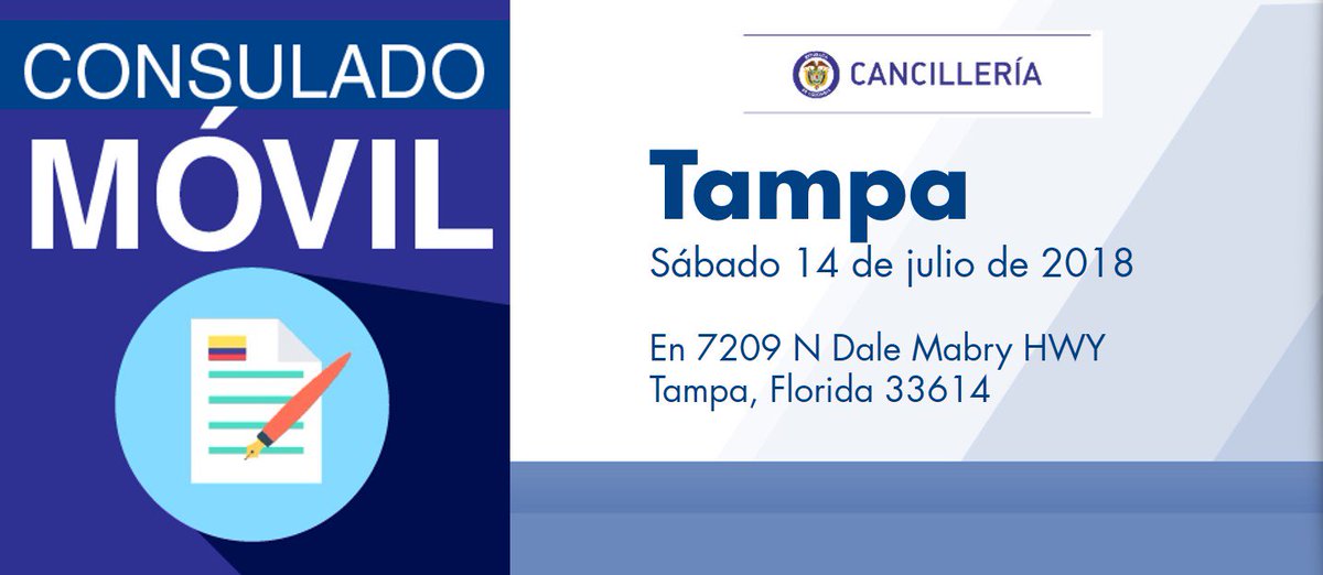 El Consulado de Colombia en Orlando realizará jornada móvil en Tampa el sábado 14 de julio de 2018 http://orlando.consulado.gov.co/node/news/17561/consulado-colombia-orlando-realizara-jornada-movil-tampa-sabado-14-julio-2018 …pic.twitter.com/bU2bCX2lt3