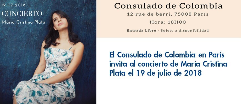 El Consulado de Colombia en París invita al concierto de María Cristina Plata el 19 de julio de 2018 http://paris.consulado.gov.co/newsroom/news/2018-07-13/17709 …pic.twitter.com/Bf8a3vFebC