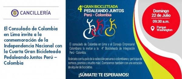 El Consulado de Colombia en Lima invita a la conmemoración de la Independencia Nacional con la Cuarta Gran Bicicleteada Pedaleando Juntos Perú – Colombia http://lima.consulado.gov.co/newsroom/news/2018-07-16/17736 …pic.twitter.com/Oo9nGTCijd