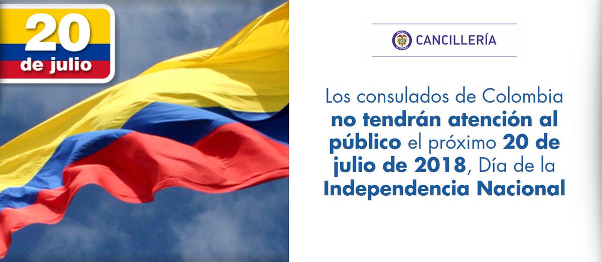 Los consulados de Colombia no tendrán atención al público el próximo 20 de julio de 2018, Día de la Independencia Nacional http://madrid.consulado.gov.co/node/news/17724/los-consulados-colombia-no-tendran-atencion-al-publico-proximo-20-julio-2018-dia-la …pic.twitter.com/zhwbH2f95P