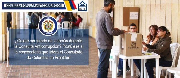 ¿Quiere ser jurado de votación durante la Consulta Anticorrupción? Postúlese a la convocatoria que lidera el Consulado de Colombia en Frankfurt http://frankfurt.consulado.gov.co/node/news/17758/quiere-ser-jurado-votacion-durante-la-consulta-anticorrupcion-postulese-la …pic.twitter.com/WGlyx1xy7d