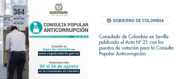Consulado de Colombia en Sevilla publicada el Acta Nº 21 con los puestos de votación para la Consulta Popular Anticorrupción http://sevilla.consulado.gov.co/newsroom/news/2018-07-25/17798 …pic.twitter.com/8qlhXLOk2Y