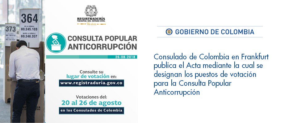 Consulado de Colombia en Frankfurt publica el Acta mediante la cual se designan los puestos de votación para la Consulta Popular Anticorrupción http://frankfurt.consulado.gov.co/newsroom/news/2018-07-27/17821 …pic.twitter.com/NgntDwia7b