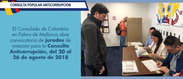 El Consulado de Colombia en Palma de Mallorca abre convocatoria de jurados de votación para la Consulta Anticorrupción, del 20 al 26 de agosto de 2018 http://palmademallorca.consulado.gov.co/node/news/17886/consulado-colombia-palma-mallorca-abre-convocatoria-jurados-votacion-la-consulta …pic.twitter.com/8VxLxdoJtQ
