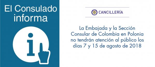 La Embajada y la Sección Consular de Colombia en Polonia no tendrán atención al público los días 7 y 15 de agosto de 2018 http://polonia.embajada.gov.co/node/news/15410/la-embajada-y-la-seccion-consular-colombia-polonia-no-tendran-atencion-al-publico …pic.twitter.com/MubxdJmoZG
