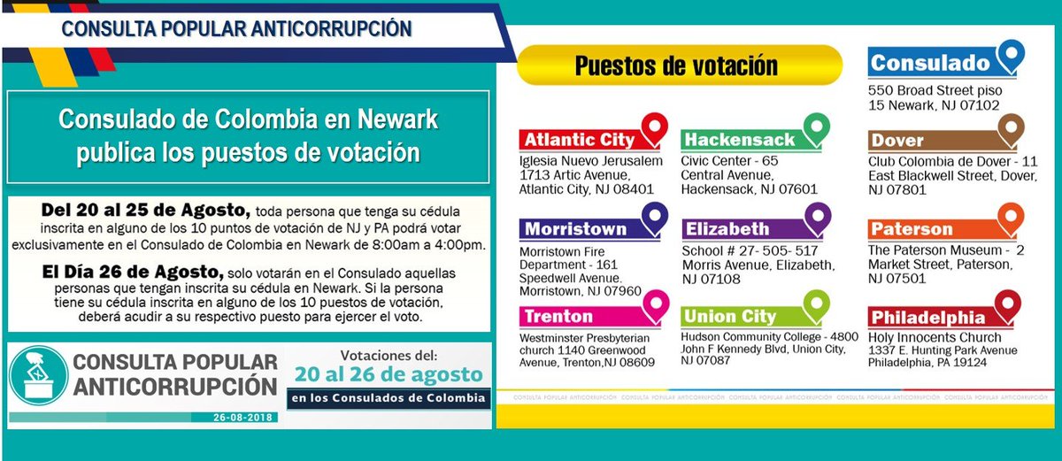 Consulado de Colombia en Newark publica los puestos de votación para la Consulta Popular Anticorrupción que se realiza hasta el 26 de agosto de 2018http://newark.consulado.gov.co/newsroom/news/2018-08-10/17921pic.twitter.com/h3I78TZSXl