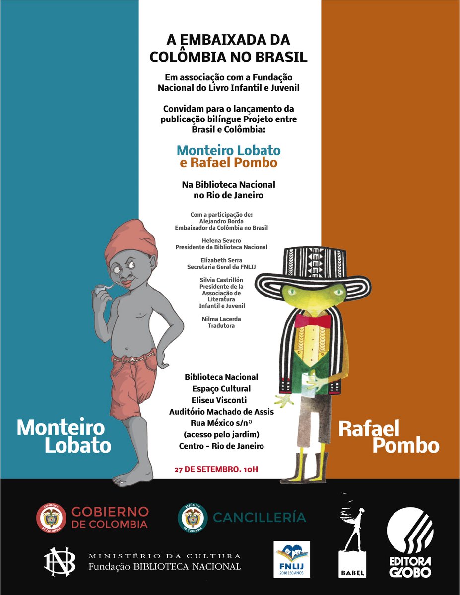 Embajada en #Brasil,en asocio con la Fundación Nacional del Libro Infantil y Juvenil invitan al lanzamiento de la publicación bilingüe entre Brasil y Colombia: Rafael Pombo y Monteiro Lovato en la Biblioteca Nacional de Rio de Janeiro, el 27 de septiembre a las 10am.Entrada librepic.twitter.com/kDx72DZi6k