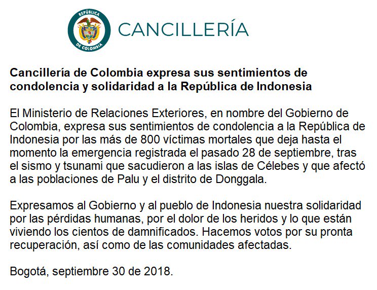 Cancillería de Colombia expresa sus sentimientos de condolencia y solidaridad a la República de Indonesiapic.twitter.com/UUGg7YPcX7
