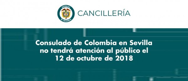 Consulado de Colombia en Sevilla no tendrá atención al público el 12 de octubre de 2018 http://sevilla.consulado.gov.co/newsroom/news/2018-10-08/18400 …pic.twitter.com/kZG1xjbn3n