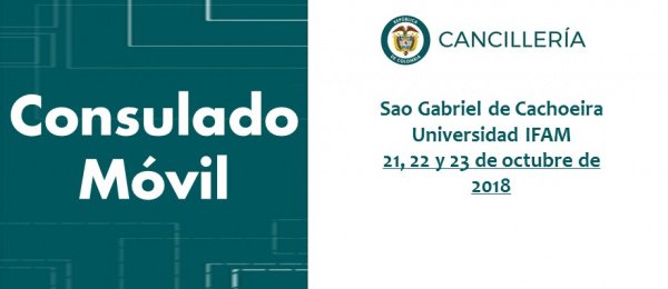 El Consulado de Colombia en Manaos realizará la jornada de Consulado Móvil del 21 al 23 de octubre de 2018 en Sao Gabriel de Cachoeira, Universidad IFAM- BR 307. http://manaos.consulado.gov.co/newsroom/news/2018-10-11/18429 …pic.twitter.com/3CmTTaB6Tx