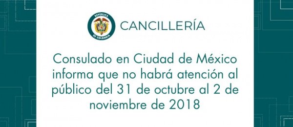 Consulado en Ciudad de México informa que no habrá atención al público del 31 de octubre al 2 de noviembre de 2018 http://mexico.consulado.gov.co/newsroom/news/2018-10-17/18474 …pic.twitter.com/GqoYqaUN6o