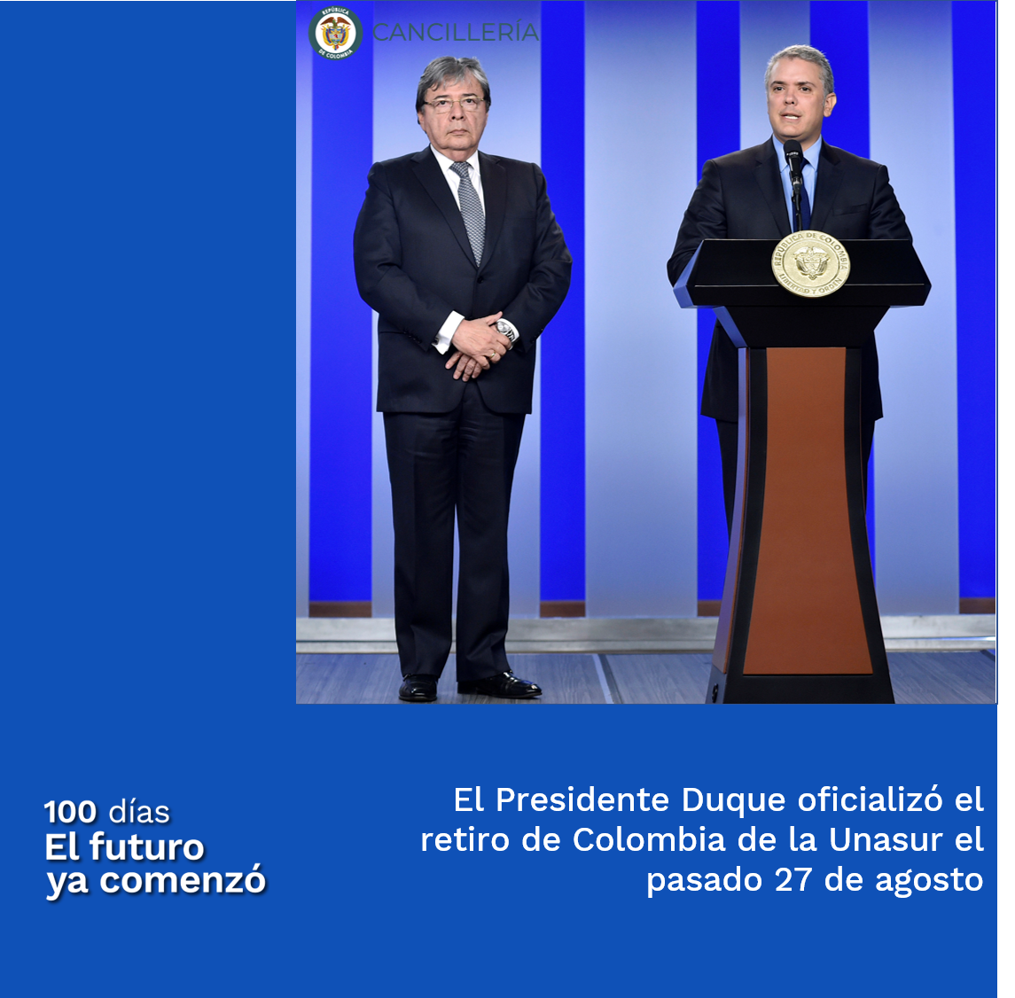 En los #Primeros100Días, tal como lo había prometido en campaña, el Presidente @IvanDuque oficializó el retiro de Colombia de la Unasurpic.twitter.com/FYhSeee1XF