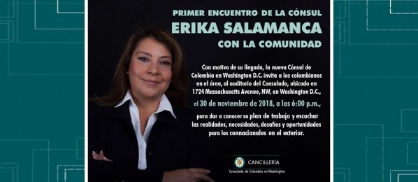 El Consulado de Colombia en Washington invita al primer encuentro de la Cónsul Erika Salamanca con la comunidad, el 30 de noviembre de 2018 http://washington.consulado.gov.co/node/news/18684/consulado-colombia-washington-invitan-al-primer-encuentro-la-consul-erika-salamanca …pic.twitter.com/aqDINj1Ht7