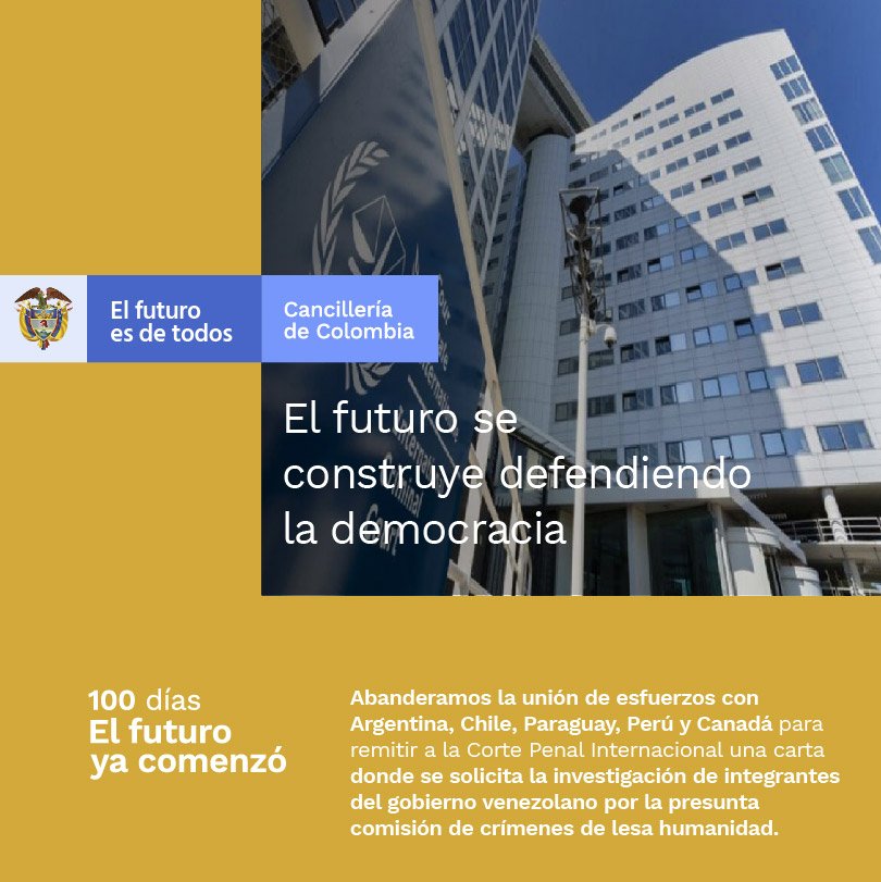 #ElFuturoYaComenzó Abanderamos la unión de esfuerzos con ARG, CHI, PAR,PER y Canadá para remitir a la CPI una carta donde se solicita la investigación de integrantes del gobierno venezolano por la presunta comisión de crímenes de lesa humanidad.Otro logro de los #Primeros100díaspic.twitter.com/0gAw8w7pYU