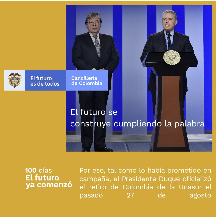 #ElFuturoYaComenzó y se construye cumpliendo la palabra. Por eso, tal como lo prometió en campaña, Presidente @IvanDuque oficializó el retiro de Colombia de la Unasur en sus #Primeros100días de Gobiernopic.twitter.com/wJqJNMZ9FW
