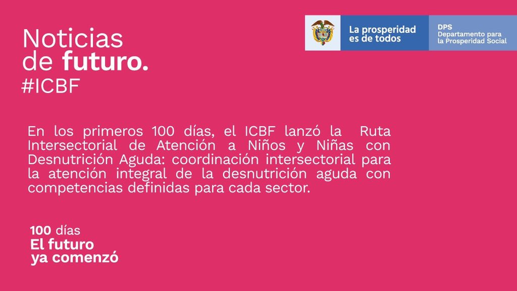 Durante los #Primeros100Días de gobierno, @ICBFColombia lanzó la ruta intersectorial de atención a niños y niñas con desnutrición aguda, un mecanismo para contribuir directamente a la disminución de la mortalidad por desnutrición. #ElFuturoYaComenzópic.twitter.com/5ruOV2n6LC